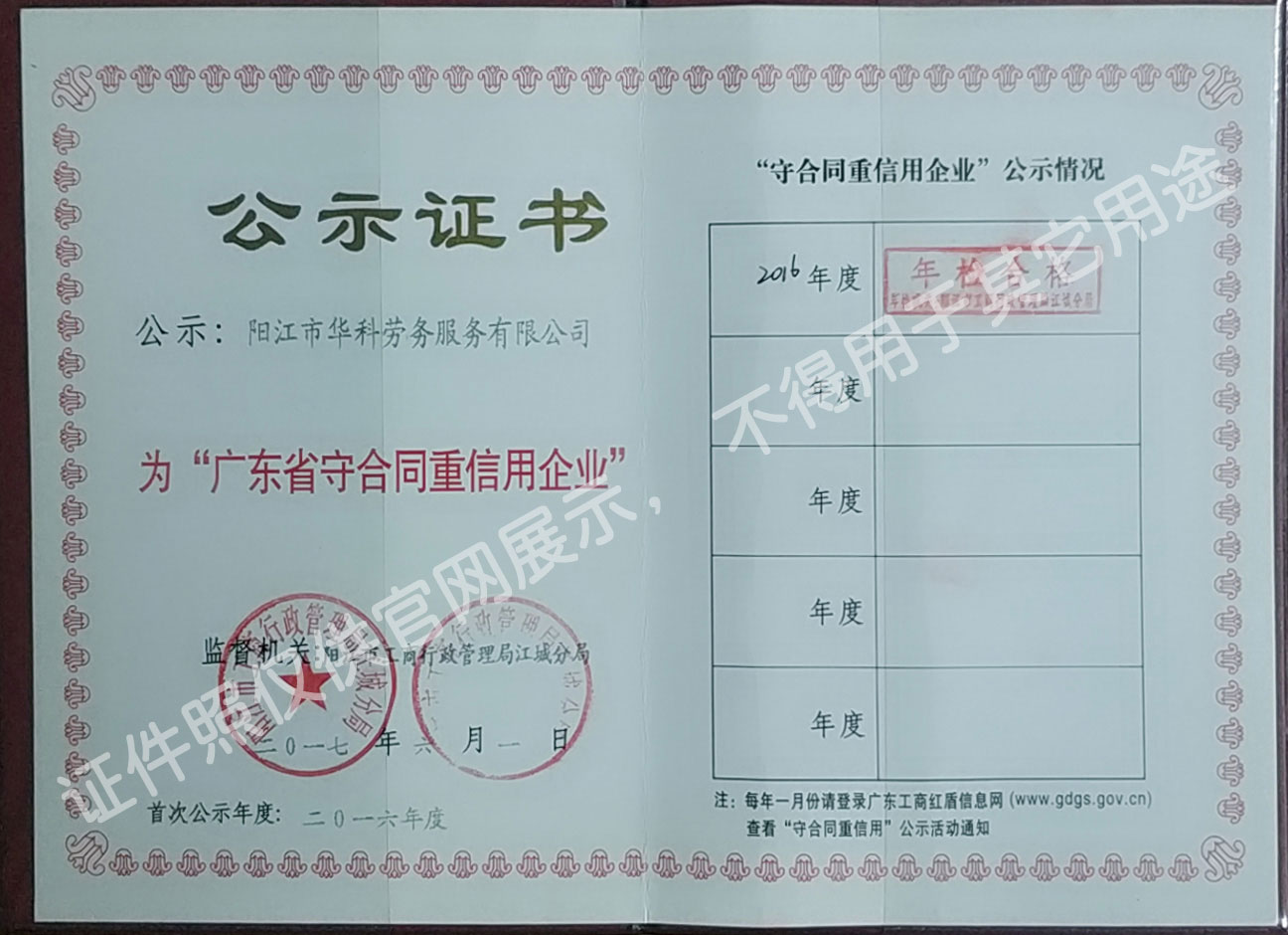 華科勞務服務有限公司是專業從事人事代理、勞務租賃、人力派遣及管理的綜合性服務機構,是首批獲得廣東省人力資源廳、陽江市勞動和社會保障局頒發人力資源許可證的合法單位。公司秉承“誠信務實、專業熱情、滿意第一、服務社群”的經營理念,在勞務派遣業務的基礎上,更致力于合同制工人(臨時工、實習生、假期工)方向發展,為用工企業及時輸送合格的各類人才,合理調配人力資源的有序流動,幫助求職者尋求更加滿意的就業渠道和崗位,切實維護求職者的合法權益。